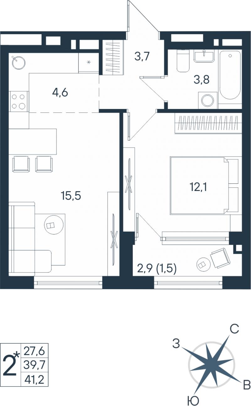 2-комн. квартира, 41.20 м², 11/14 этаж