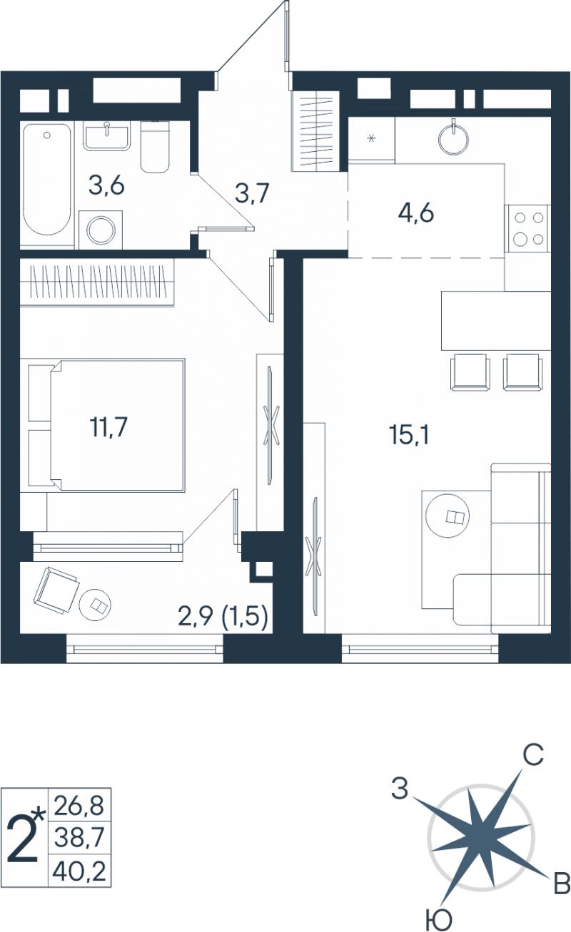 2-комн. квартира, 40.20 м², 11/14 этаж