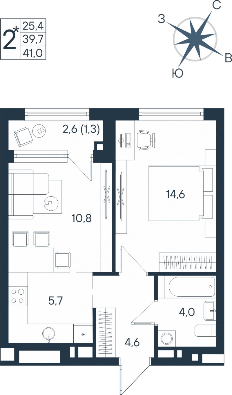 2-комн. квартира, 41.00 м², 4/14 этаж