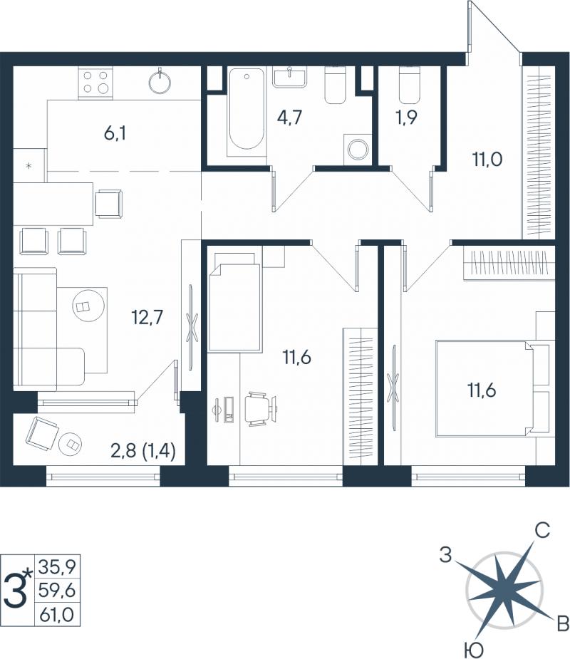 3-комн. евро 59.90 м² 3/6 эт.