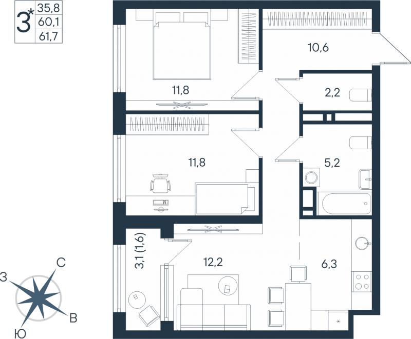 3-комн. квартира, 61.70 м², 10/14 этаж