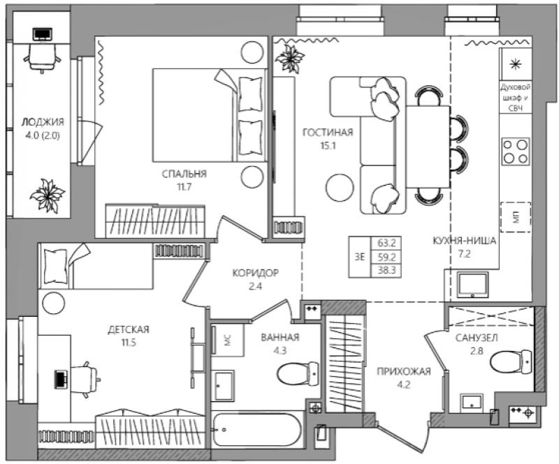 3-комн. квартира, 61.20 м², 2/16 этаж