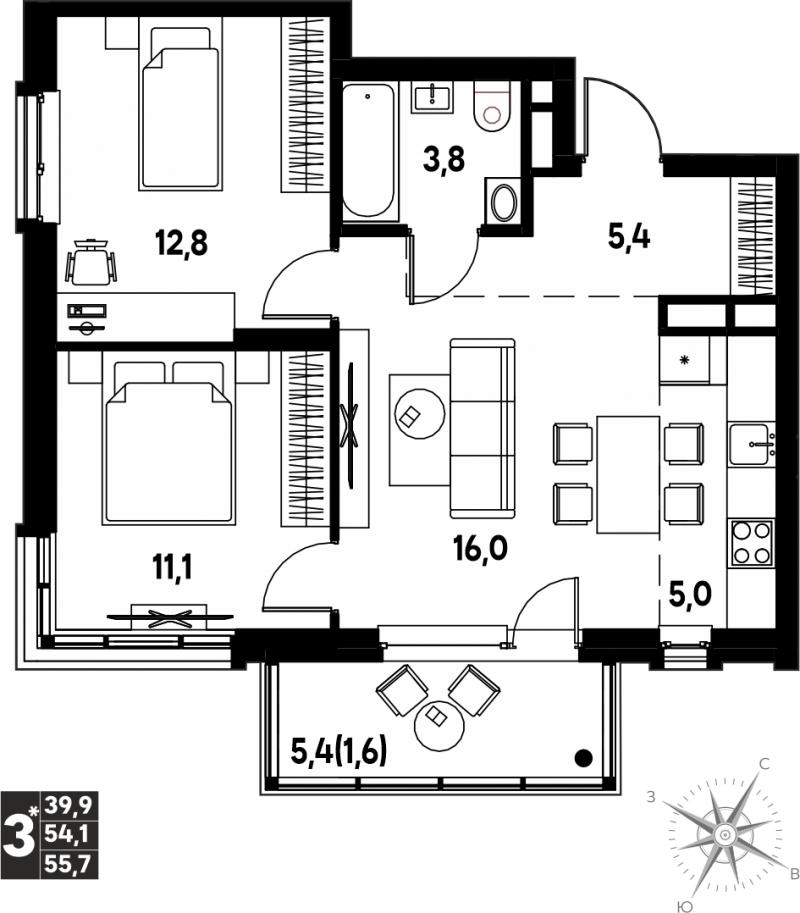 3-комн. квартира, 55.70 м², 5/16 этаж