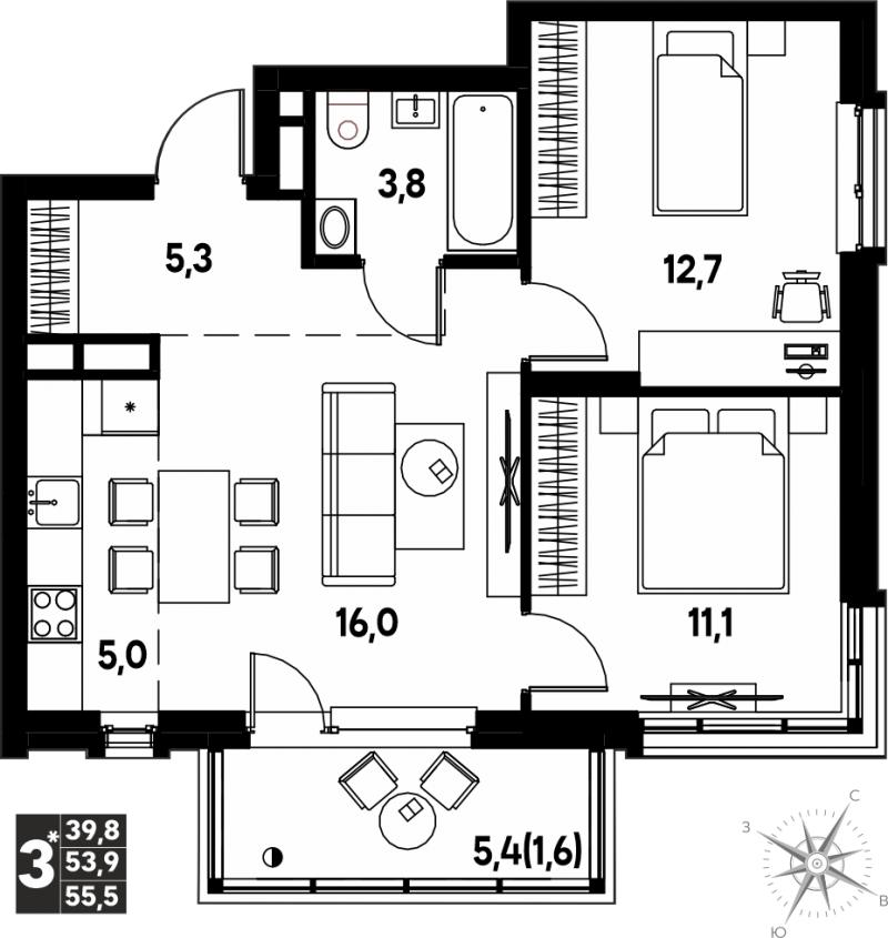 3-комн. квартира, 55.50 м², 6/16 этаж