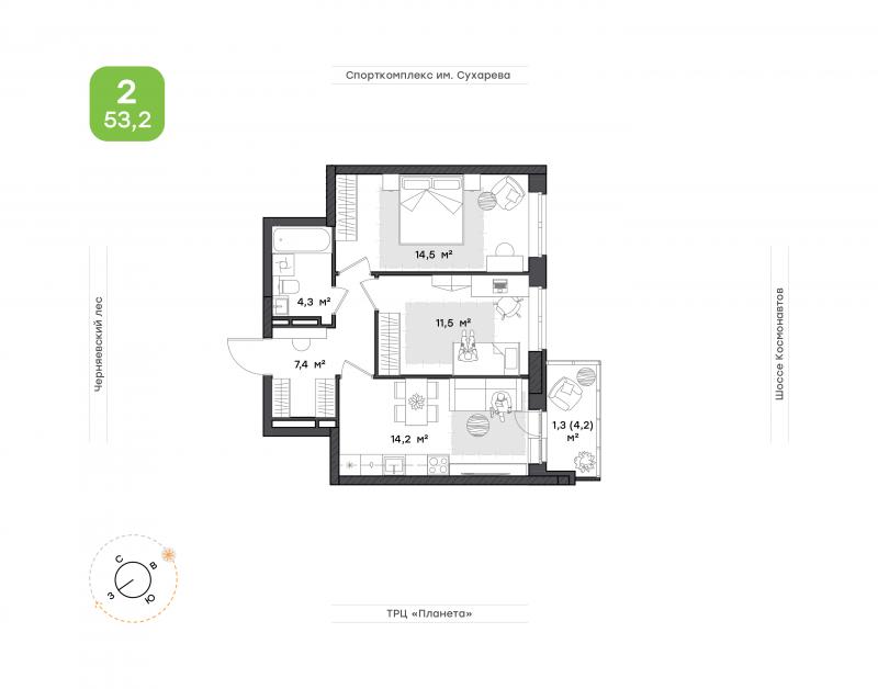 Для вашего удобства мы разместили один санузел рядом со спальней.