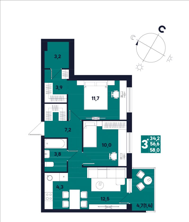 3-комн. квартира, 58.00 м², 2/9 этаж