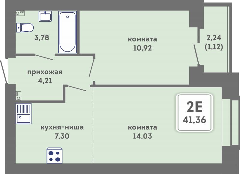 2-комн. квартира, 41.36 м², 6/6 этаж