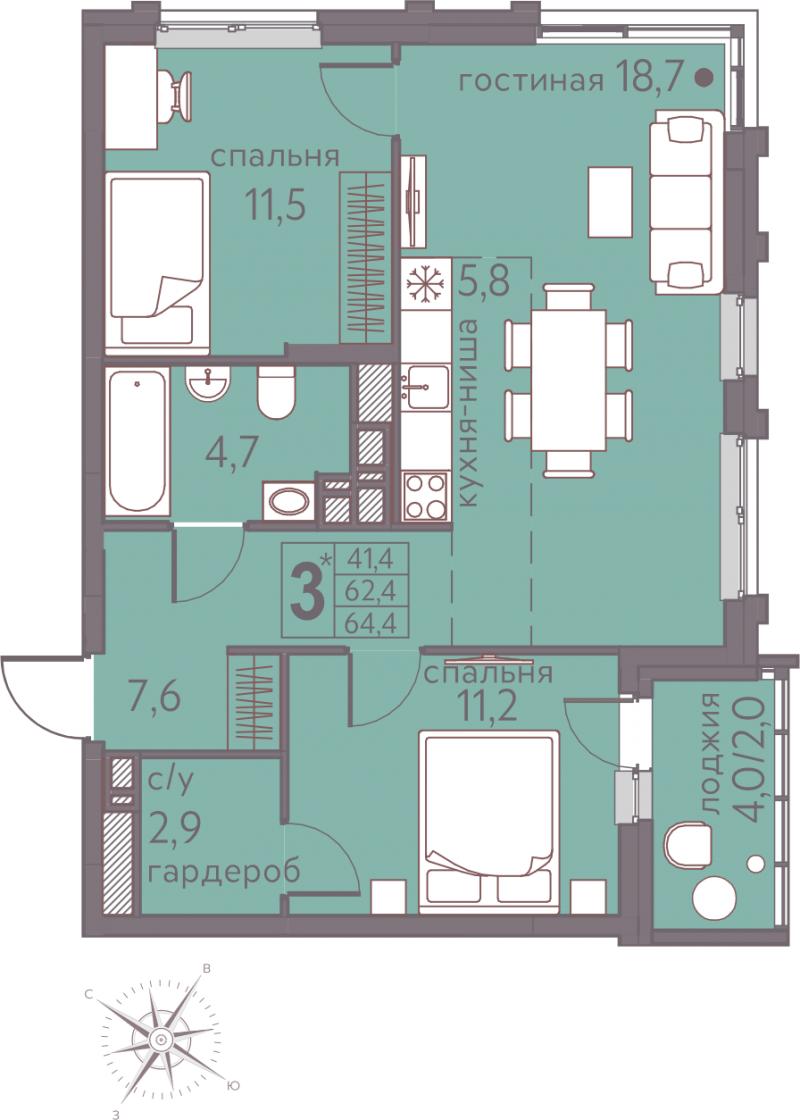 3-комн. квартира, 64.40 м², 20/22 этаж