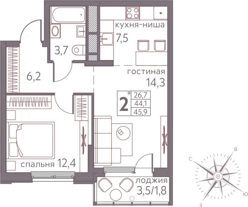 2-комн. квартира, 45.90 м², 6/17 этаж