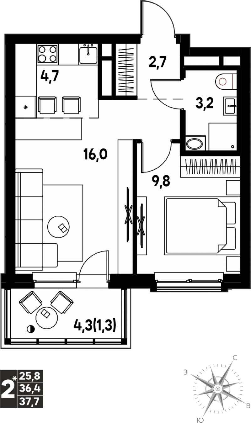 2-комн. квартира, 37.70 м², 14/16 этаж