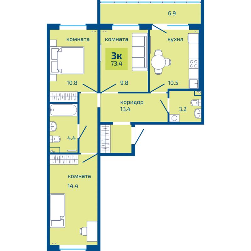 3-комн. квартира, 73.40 м², 1/11 этаж