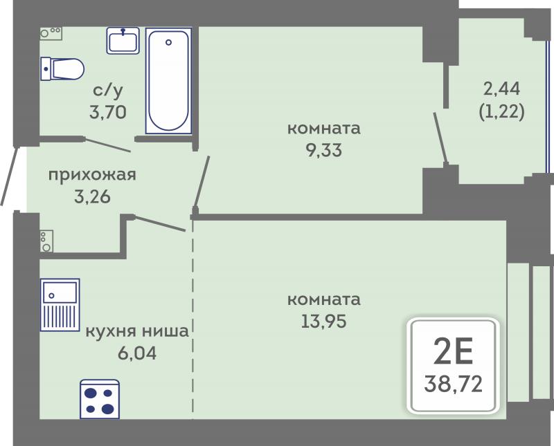 2-комн. квартира, 38.72 м², 6/6 этаж