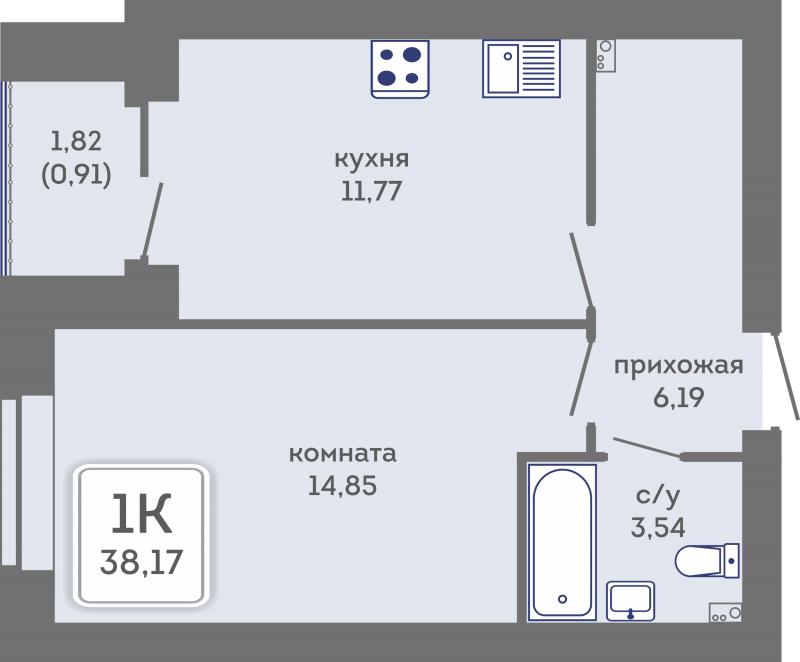 1-комн. квартира, 38.17 м², 6/6 этаж