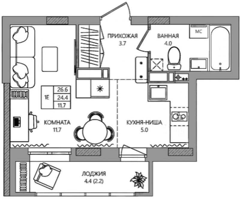 1-комн. квартира, 26.60 м², 15/16 этаж