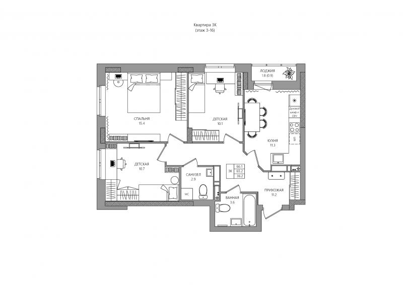 3-комн. квартира, 66.10 м², 5/16 этаж
