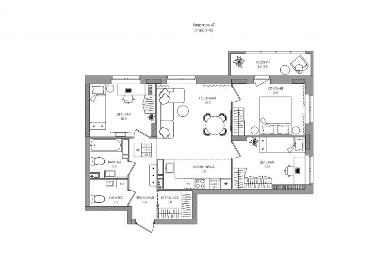 4-комн. квартира, 72.10 м², 10/16 этаж