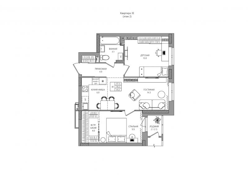 3-комн. квартира, 57.30 м², 2/16 этаж