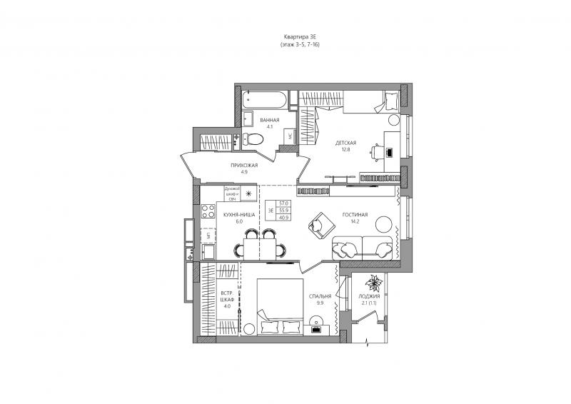 3-комн. квартира, 57.00 м², 12/16 этаж