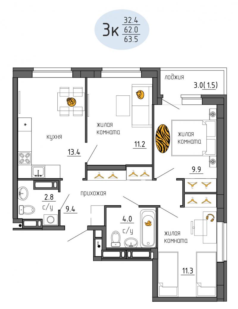Продается 3- комнатная квартира N 294 в ЖК Утро.
