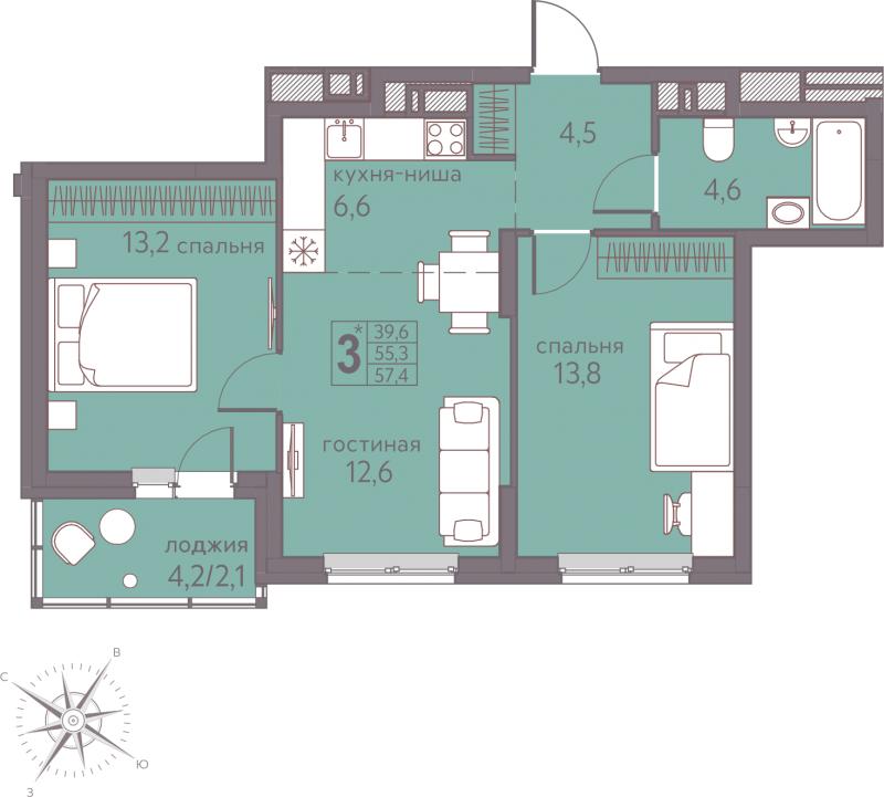 3-комн. квартира, 57.40 м², 10/22 этаж