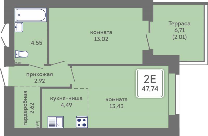 2-комн. квартира, 47.74 м², 1/6 этаж