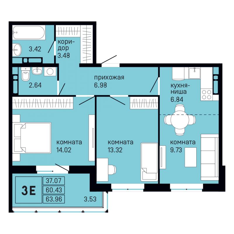 3-комн. квартира, 63.96 м², 12/10 этаж
