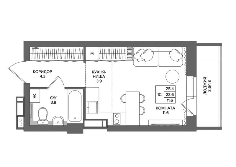 1-комн. квартира, 25.40 м², 13/17 этаж