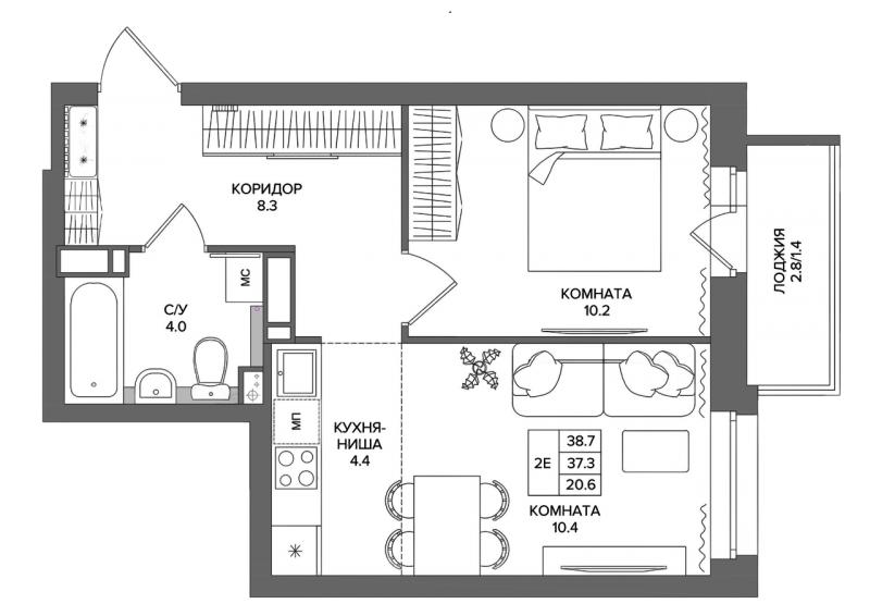 2-комн. квартира, 38.70 м², 11/17 этаж