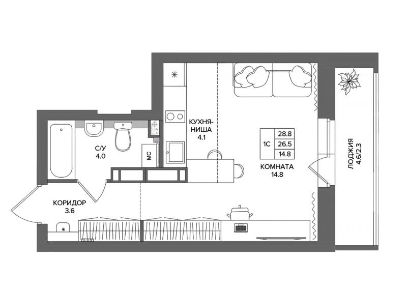 1-комн. квартира, 28.80 м², 15/17 этаж