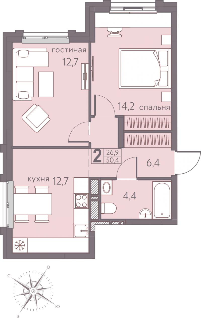 2-комн. квартира, 50.40 м², 16/22 этаж
