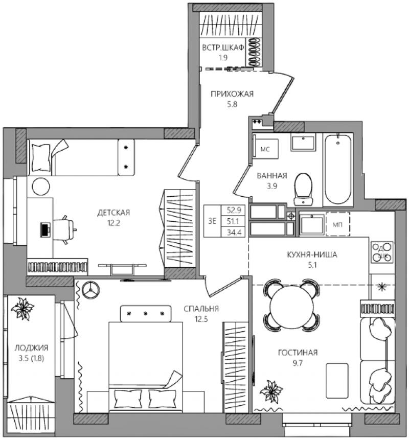 3-комн. квартира, 52.90 м², 4/16 этаж