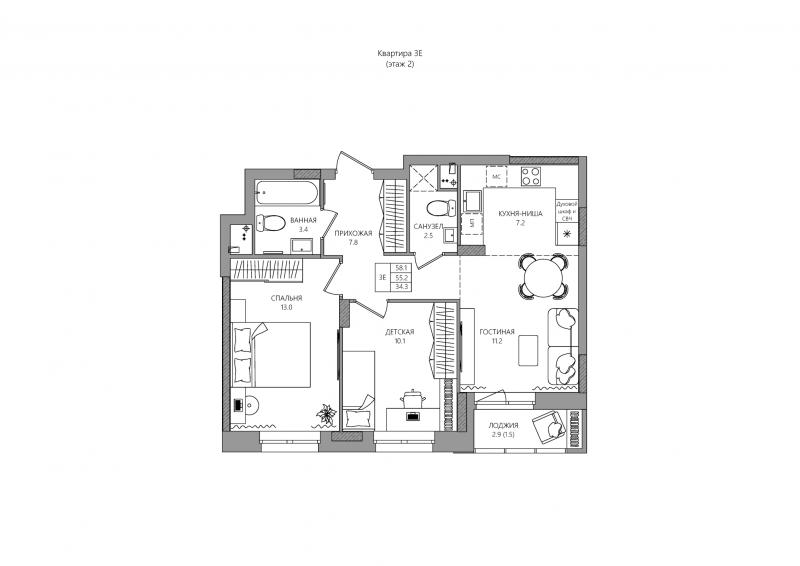 3-комн. квартира, 56.70 м², 2/16 этаж