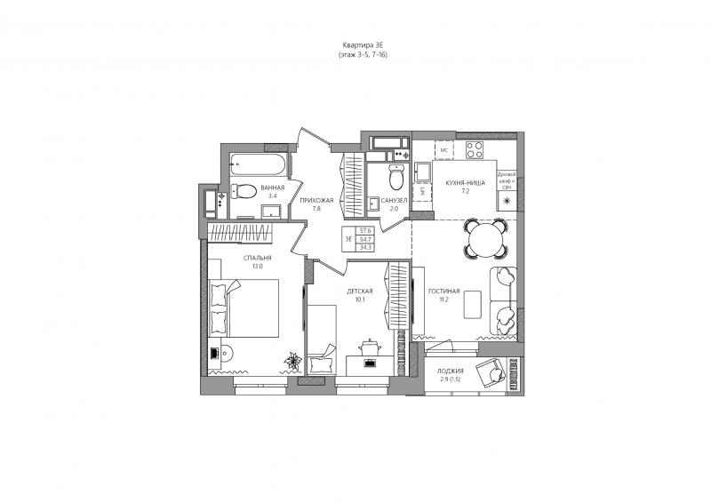 3-комн. квартира, 56.20 м², 11/16 этаж