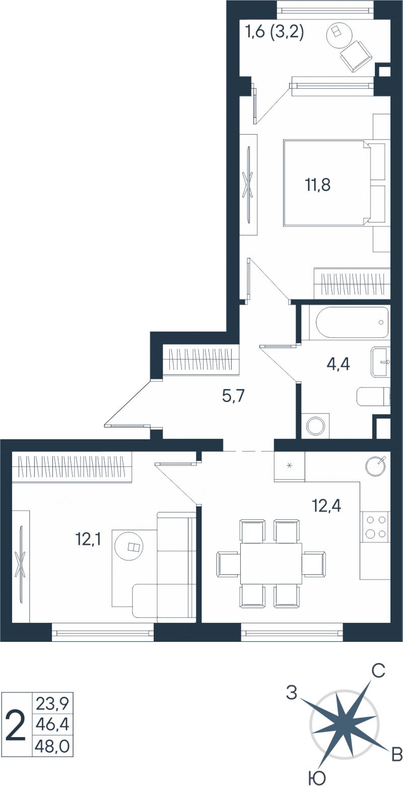 2-комн. квартира, 48.00 м², 2/14 этаж