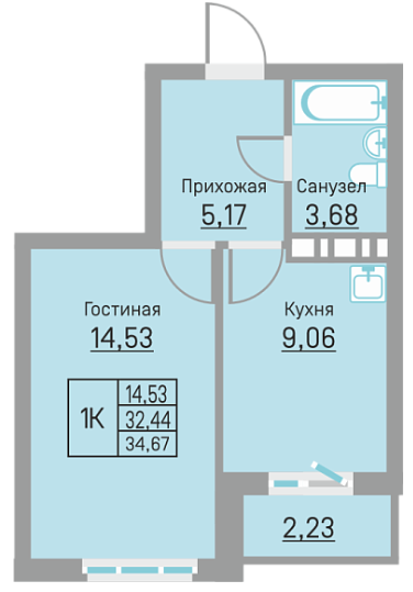 1-комн. квартира, 34.67 м², 8/16 этаж