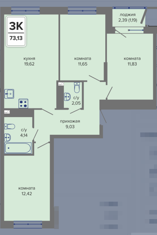 3-комн. квартира, 73.13 м², 8/14 этаж