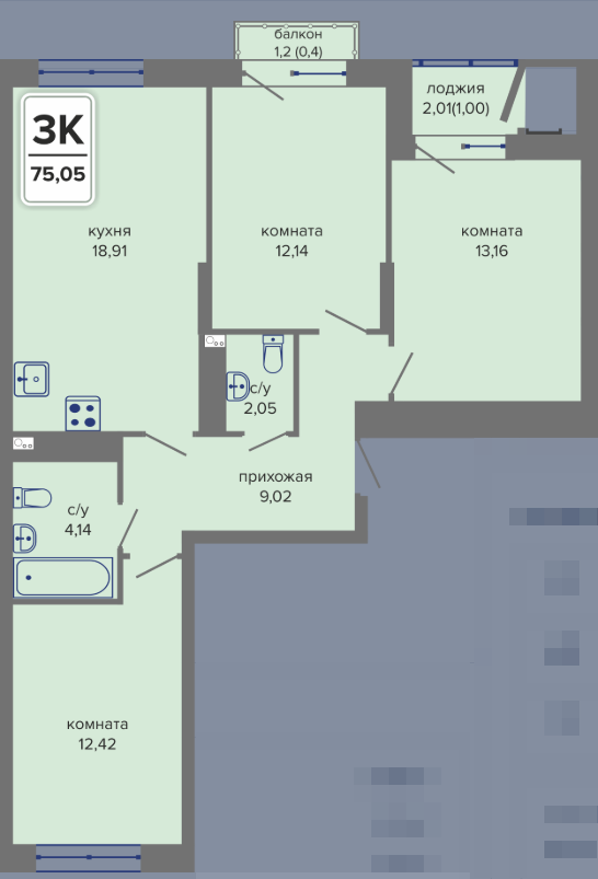 3-комн. квартира, 75.05 м², 10/14 этаж