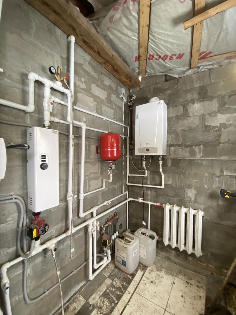 Отопление отгазового котла в рабочем состоянии, жидкость залита: на первом этаже теплый пол и радиаторы, на втором этаже радиаторы. Дополнительно установлен элекетрокотел и печка. Все новое, в доме никто не жил. Электроэнергия - 380 В/15 кВт, счётчик установлен, сделана разводка с установкой выключателей и розеток по всему дому, автоматы выведены под каждую розетку отдельно. Вода - скважина 12 метров. Под канализацию сделаны только отводы. Отделку дома нужно доделывать.